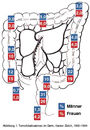 Darmkrebs kommt nicht überall im Darm gleich häufig vor. Am häufigsten tritt Darmkrebs im Dickdarm auf, wobei dieser in den rechtsseitigen Dickdarm (Coecum und Colon ascendens), das Querkolon (Colon transversum), das Sigma und das Rectum (Mastdarm) unterteilt wird. Tumore im Dünndarm kommen äusserst selten vor.